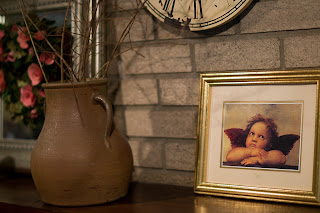 The framed cherub print is one we see everywhere, but it was just right to complete my simple little mantel.